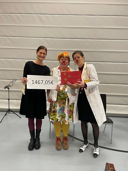 Die Clinic-Clowns besuchten uns. Wir konnten ihnen bei der Feier unser gesammeltes Geld von der Leseaktion überreichen.